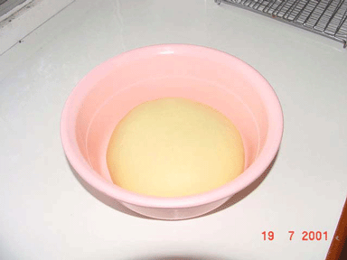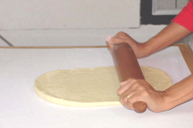 เมื่อโดได้ที่แล้วนำก้อนโดมารีดให้แผ่ออกและพับเป็นแผ่นสี่เหลี่ยมสามทบสองครั้ง