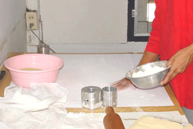 ก่อนวางโดลงบนโต๊ะให้นำแป้งโรยลงบนโต๊ะก่อน