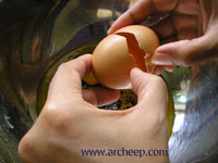 ตอกไข่ไก่ 2 ฟอง ลงไปในชามผสมใบใหญ่