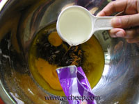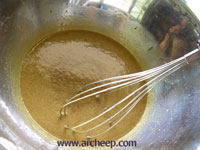ใช้ตะกร้อตีไข่ให้ส่วนผสมเข้ากันดีเป็นเนื้อเดียวกัน |