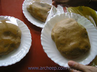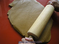 ใช้ไม้นวดแป้งนวดคลึงแป้งให้ได้ความหนาประมาณ 1/2 นิ้ว