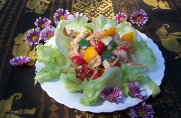 ปลาหมึกลวก เนื้อปูม้าแกะนึ่งสุก ตามด้วยพริกหวาน |