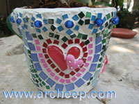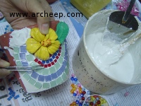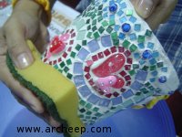 ใช้คีมปากแหลมคีบโมเสคติดลงบนปูนยาแนวจัดวางให้สวยงามตามความเหมาะสมรอให้ปูนยาแนวแห้งสนิท