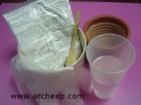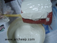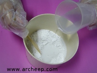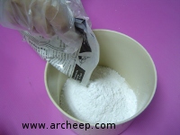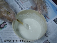 2.เทปูนยาแนวลงในภาชนะพลาสติกกะตามขนาดของชิ้นงานที่จะใช้ทำ