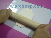 ใช้ไม้คลึงดินเยื่อกระดาษให้เรียบเนียน |