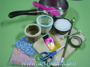 ใบใส่ดินน้ำมันลงตะกร้าหรือดินเยื่อกระดาษแล้วโรยด้วยหินสีให้เต็มตะกร้า