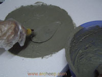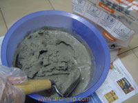 เทปูนซีเมนต์ที่ผสมเสร็จลงในภาชนะใส่น้ำและคนให้เข้ากันดี