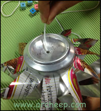 ลวด(อะไรก็ได้ตามใจชอบ) มาร้อยลงไปในรูกังหันลมกระป๋อง
