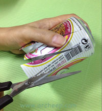 3. นำกระดาษที่ตัดมาแล้วใช้เทปใสติดที่กระป๋องเครื่องดื่มที่ใช้แล้ว