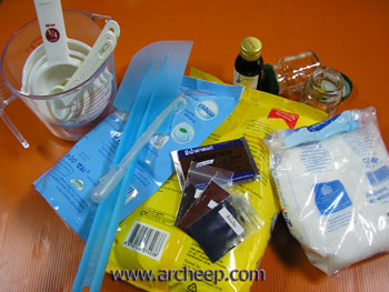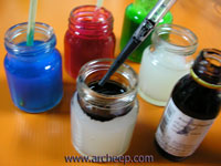 ลงในภาชนะตามปริมาณและจำนวนขวดแบ่งที่ต้องการแล้วจึงหยดสีผสมอาหารลงไปเพื่อให้ง่ายต่อการผสมทีละน้อย