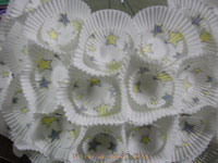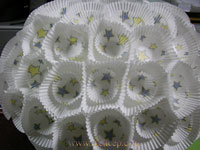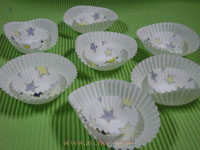 นำถ้วยกระดาษใบเล็กแฟนซีที่มีกาวมาติดใส่ลงไปในถ้วยกระดาษใบใหญ่ทำเตรียมไว้หลาย