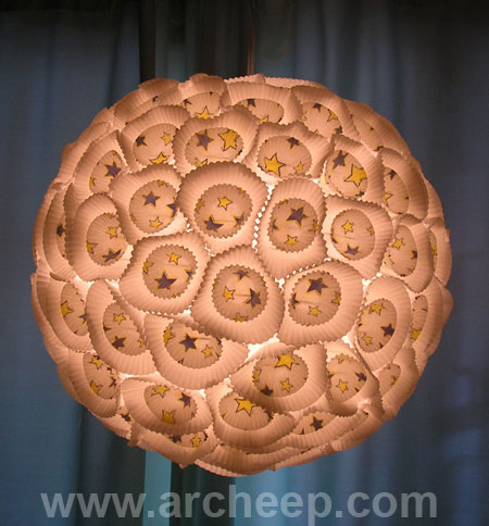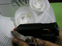 นำถ้วยกระดาษที่มีกาวมาติดที่โคมกระดาษญี่ปุ่นด้านบนให้เต็มก่อนค่ะ |