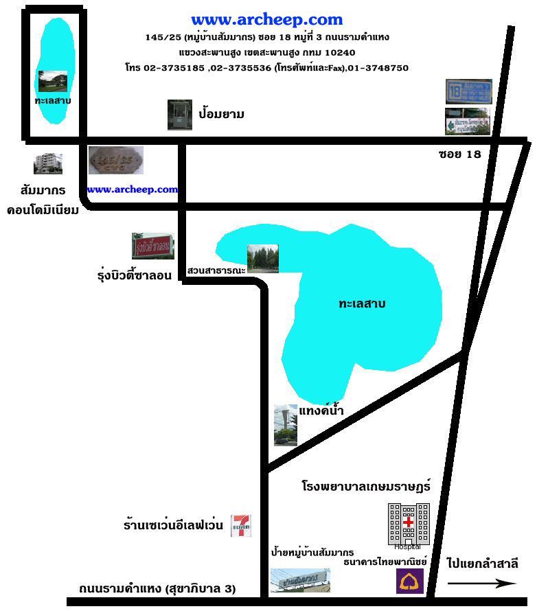 ผมเลยทำแผนที่มาให้ดู หาไม่ยากครับ เราอยู่ เลขที่ 145/25 (หมู่บ้านสัมมากร) ซอย 18 ถนนรามคำแหง (อยู่ฝั่งขาเข้าเมืองนะครับ